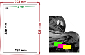 Texte solltest Du mind. 2mm vom Rand (Endformat) entfernt platzieren, da es beim Schneiden Toleranzen von 1-2 mm geben kann. Wenn Deine Texte mit ausreichender Entfernung vom Rand platziert sind, bist Du auf der sicheren Seite. Achtung! Bei Produkten mit Spiralbindung unbedingt 16 mm Abstand im Bund einhalten, sonst läuft der Text in die Spirale.